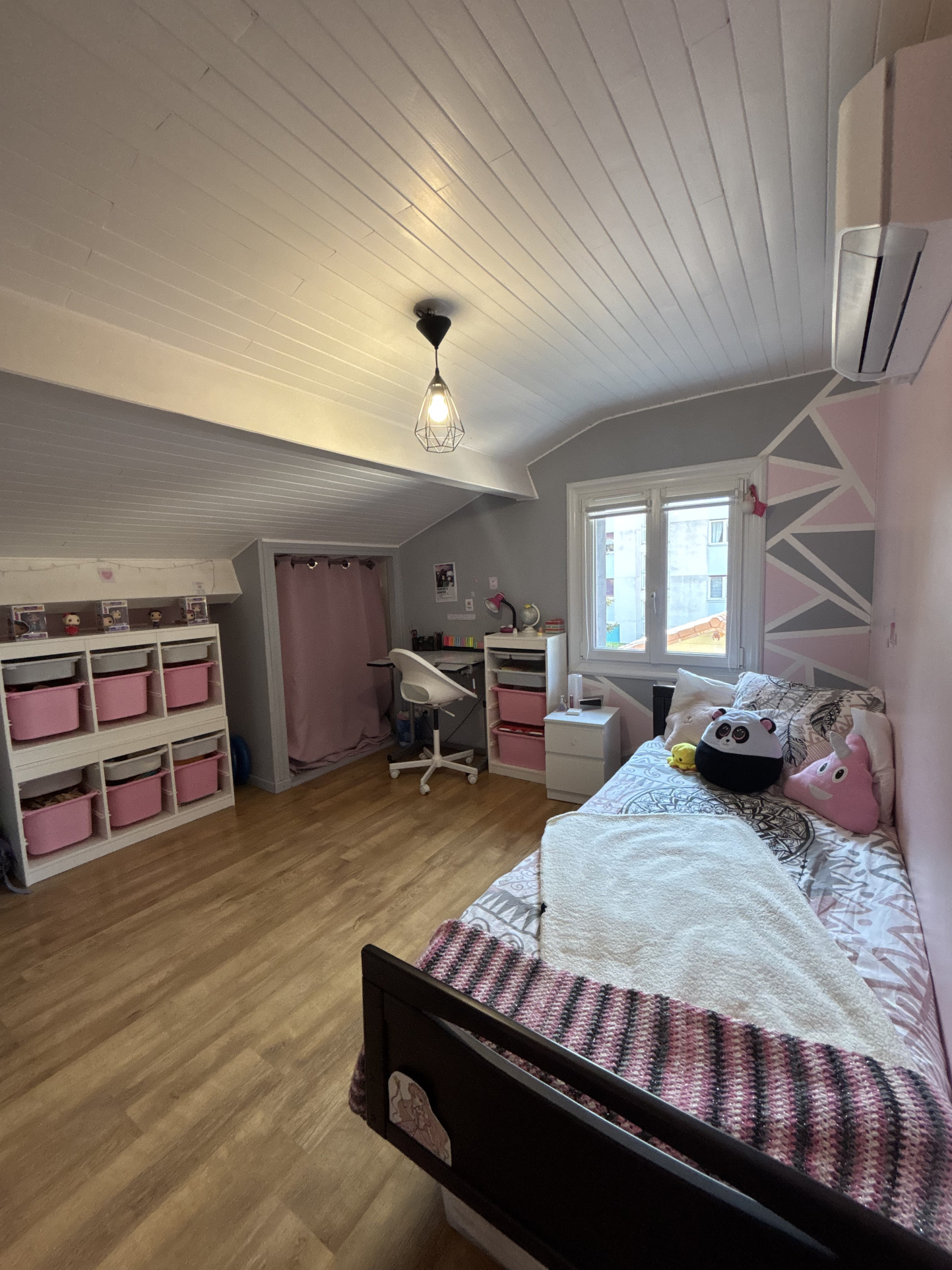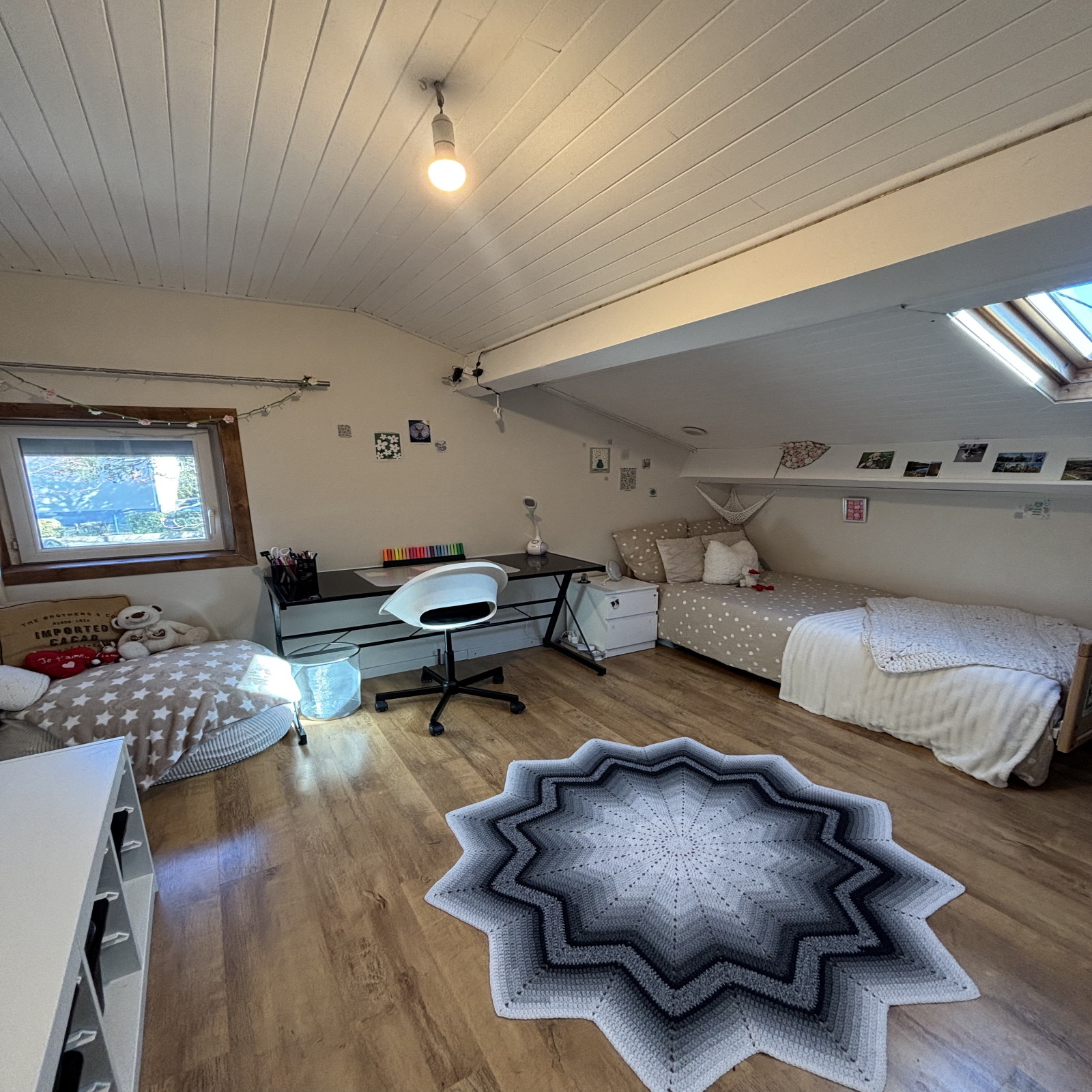 À l’étage, trois chambres et un bureau composent le territoire des enfants, des projets, du télétravail. Les beaux planchers d’époque craquent légèrement (c’est mon langage à moi), la hauteur sous plafond donne de l’air aux idées. On s’y sent à la fois protégé et libre.