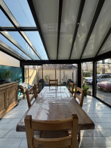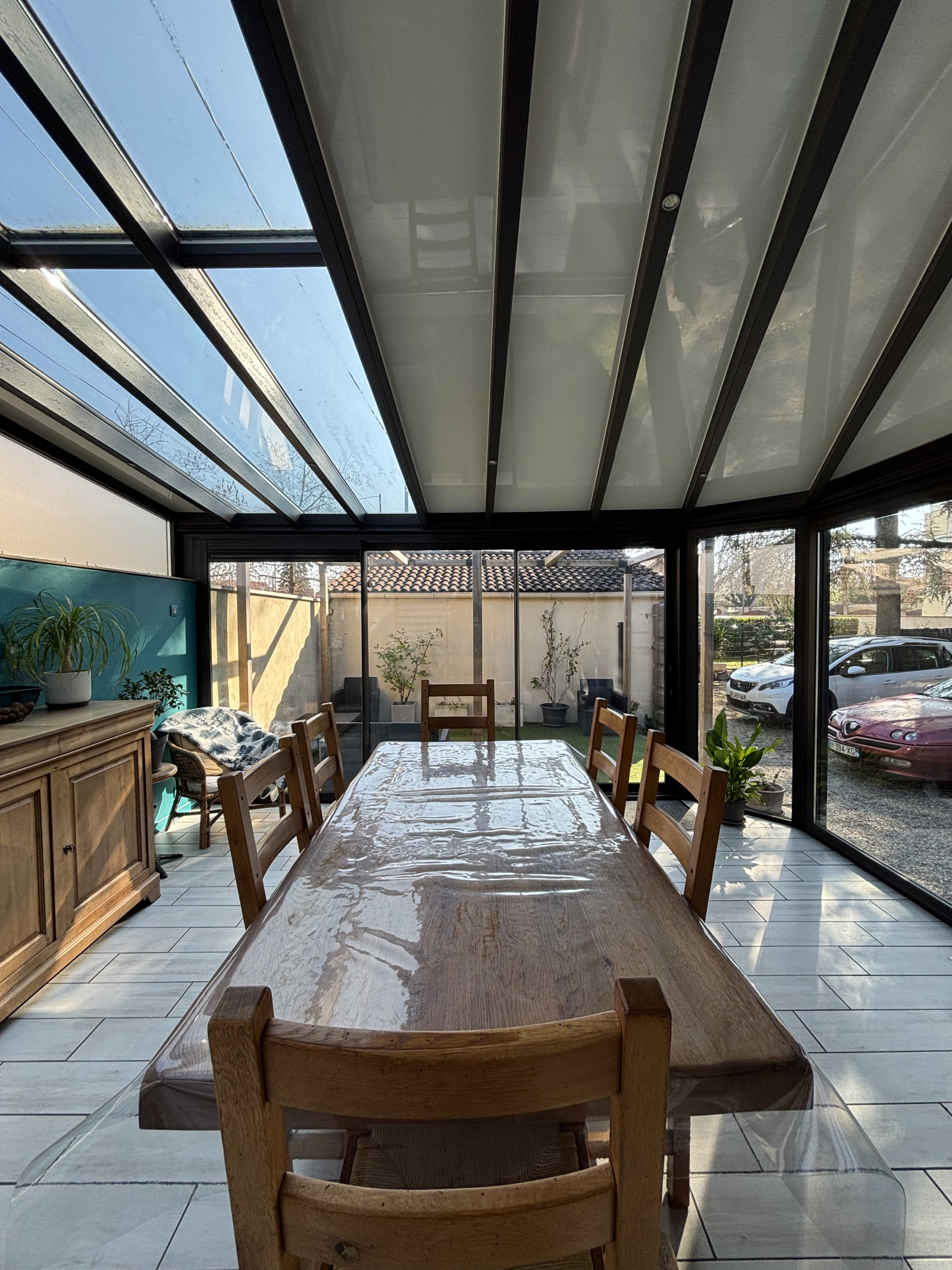 Tout commence par ma véranda. C’est par là que vous entrez. Pas par un simple couloir, non. Par une pièce baignée de lumière, ouverte sur le jardin. Imaginez un matin d’hiver : la rosée encore accrochée aux arbres centenaires classés, le café qui fume doucement sur la table, la chaleur enveloppante malgré le froid dehors. Ou un soir d’été, les baies ouvertes, les rires qui s’échappent vers le jardin pendant que le ciel rosit. Ici, les repas ne sont pas pressés. Ils se prolongent.