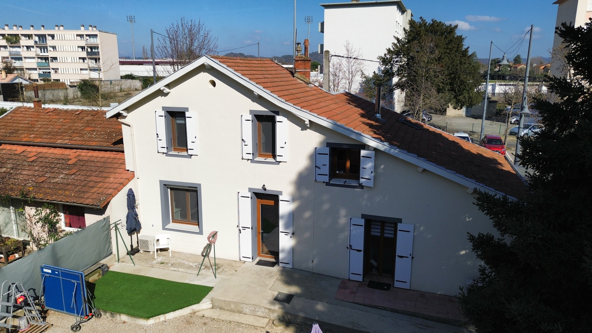 Et dehors… 1000 m². Rare, précieux, presque irréel à deux pas de l’hypercentre de Romans-sur-Isère. Mes arbres centenaires classés veillent, offrent une ombre fraîche en été. On y installe une grande table, on y laisse courir les enfants, on y respire vraiment. La dépendance de 18 m² devient chambre d’ado, studio d’ami, espace créatif. L’indépendance sans l’éloignement.